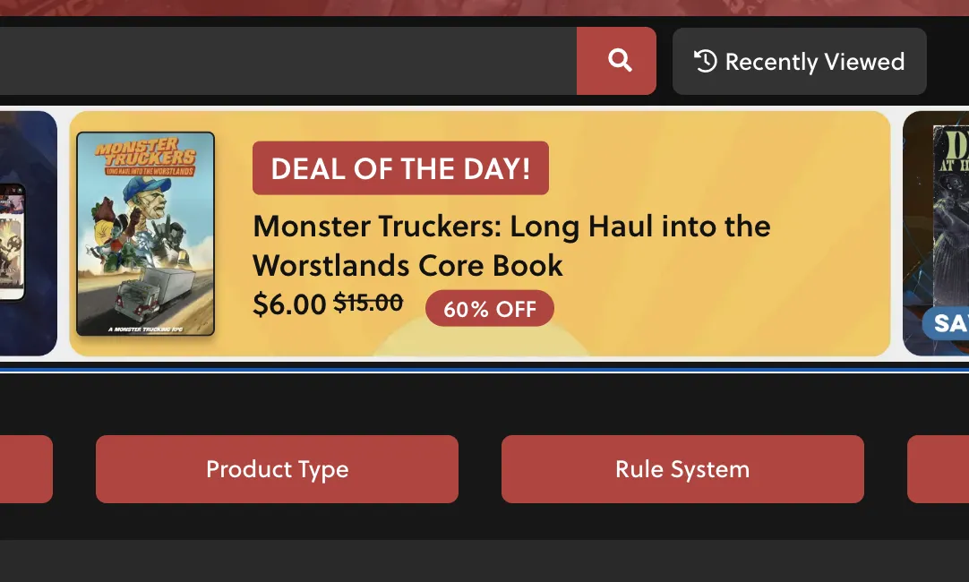 Drive Thru RPG’s Deal of the Day is just what it says, it’s a deal for one day. It’s only on one item and it’s at least 40% off, but likely more (the publisher decides how much they want to reduce the price). It’s advertised on the top of their page, and in banners and what not around Drive Thru RPG, in a newsletter, and likely in more places I’m not aware of.