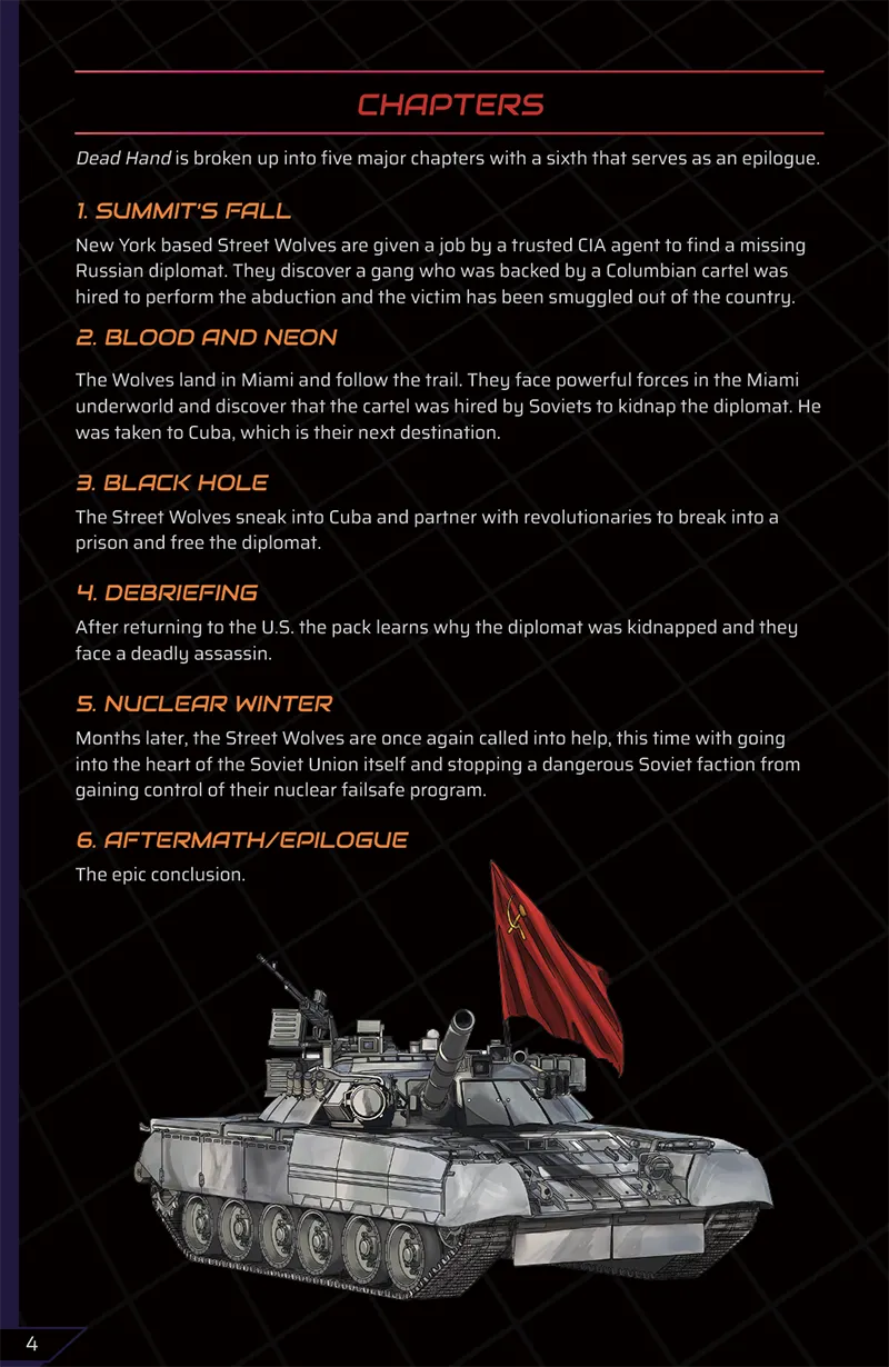 The Street Wolves are tasked with tracking down a missing Soviet diplomat and they soon uncover a nefarious plot by a Russian ultra-nationalist movement and the Network of Shadows to seize control of the Soviet Union’s nuclear arsenal. With it, they will hold the world hostage, and remake it in their image.