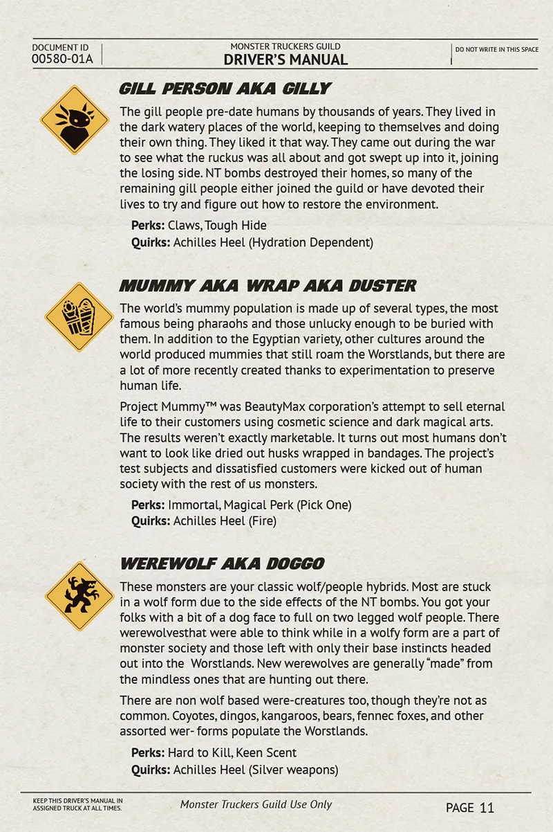 Get behind the wheel of a big rig as a classic monster like vampires, mummies, werewolves, ghosts and more! Monster Truckers is an easy to learn and low prep tabletop role playing game featuring semi truck driving monsters in a post-apocalyptic world. They make deliveries, discover weird and mysterious stuff, get into scrapes, and maybe help out a few folks as they experience (un)life on the road. Monster Truckers is inspired by ’70s trucker movies and culture, classic movie monsters, a bit of Adventure Time and Mad Max, and the freewheeling freedom that was once promised to be out on the open road.