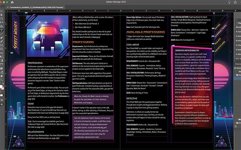 That’s right, I’m hard at work putting the Street Wolves core book together! The dream is coming closer to reality! So far it’s going smoothly, but there will be some bumps like having to finish the character sheets and adjusting stock art assets so they don’t look so “stock”.