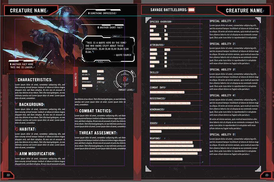 The parts I worked on in particular were the template layout for each individual monster showing off their stats and details. The image above is an early version of the template I made for them. The book is a catalog of monsters you can buy in the Battlelords universe. For the design, I stuck with a more or less contemporary sci-fi look, but also tried to make some of it look like it was displayed on an older computer.