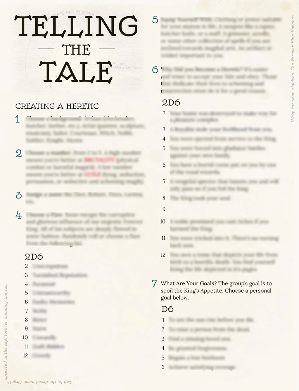 The Forever King is a dark fantasy, rules light table top role playing game featuring a group of desperate Heretics hoping to spoil the King’s hunger. It features mechanics inspired by Lasers and Feelings, the popular and proven mechanics light ttrpg.